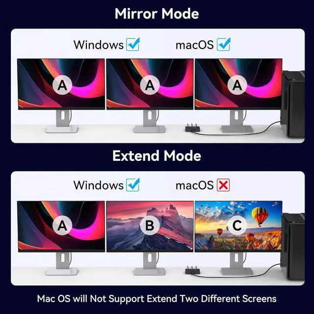 Note: To achieve 4K resolution please make sure your device and cable both support DP 1.4 dp input cable length no more than 1.8M and the DP output cable length does not exceed 2MExpansion Mode and Mirror ModeThis display port splitter 3 Monitors supports expansion mode and mirroring mode. In Extended Mode the computer and two monitor screens can display different images at the same time (ABC); in Mirror Mode both screens display the same image (AAA/ABB).