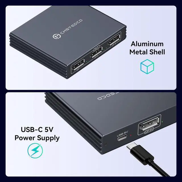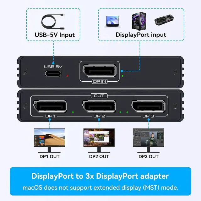 Note: Extended mode can only be used if the computer supports MST Mac OS cannot use extended mode due to its own limitation of only supporting SSTWide CompatibilityThis dp to 3 dp splitteris widely compatible with all computers equipped with DP/DP++/DisplayPort++ source ports on the market compatible with DP 1.4 supports 3D/4K HD. no driver installation plug and play. Great for multimedia teaching conference room office and gamingAluminum HousingThe dp to triple display port splitter is made of aluminum alloy housing for corrosion resistance excellent performance stylish appearance and better heat dissipation. If you encounter any problems when using the product you can always contact us through we will provide you with a solution within 24 hours