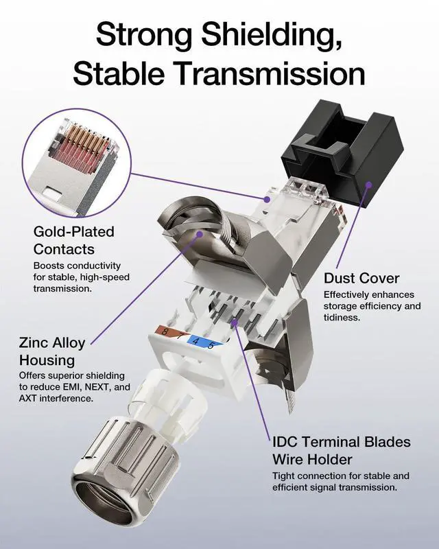 EASY INSTALLATION: The CAT7 Ethernet connector enables easy installation and disassembly without crimping tools (Cutting tools and Stripper are still needed.), ideal for novices and low-volume jobs. The dust cover protects RJ45 contacts during storage