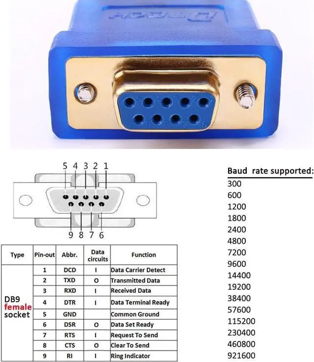 Convert USB into RS232: directional 6ft USB to serial cable with standard USB Type A Male port and DB9 female serial connector (9 wire pinout 1-9: DCD, RXD, TXD, DTR, GND, DSR, RTS, CTS, RI)