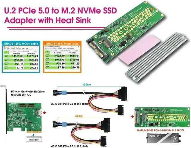 The adapter supports M.2 NVMe SSDs, typically in sizes ranging from 2242, 2260, 2280, or 22110, and enables connection via a U.2 (SFF-8639) interface.