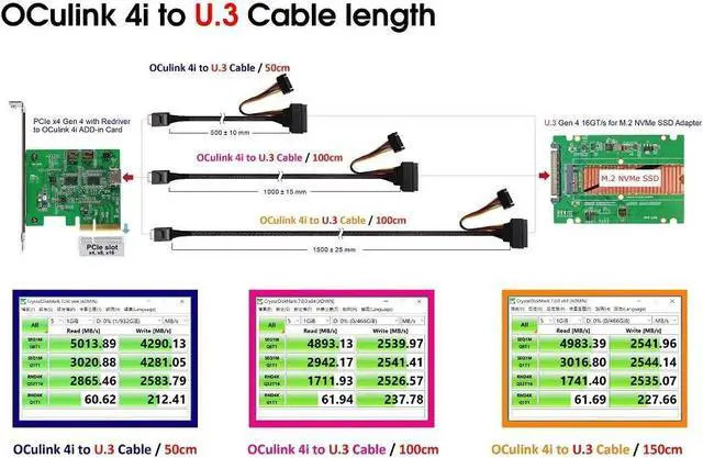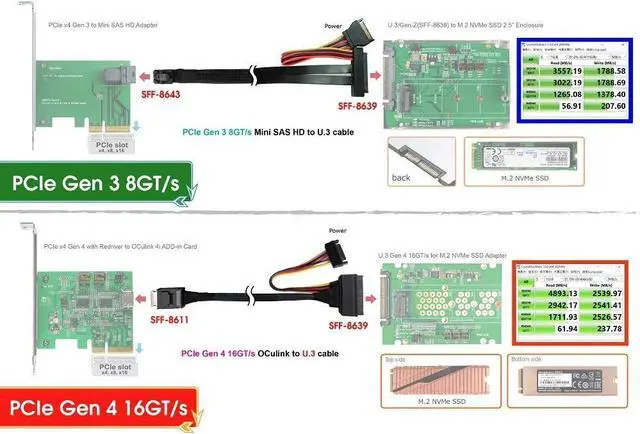 Connects an Oculink drive to a U.3 drive using the SFF-8611 and SFF-8639 connectors.