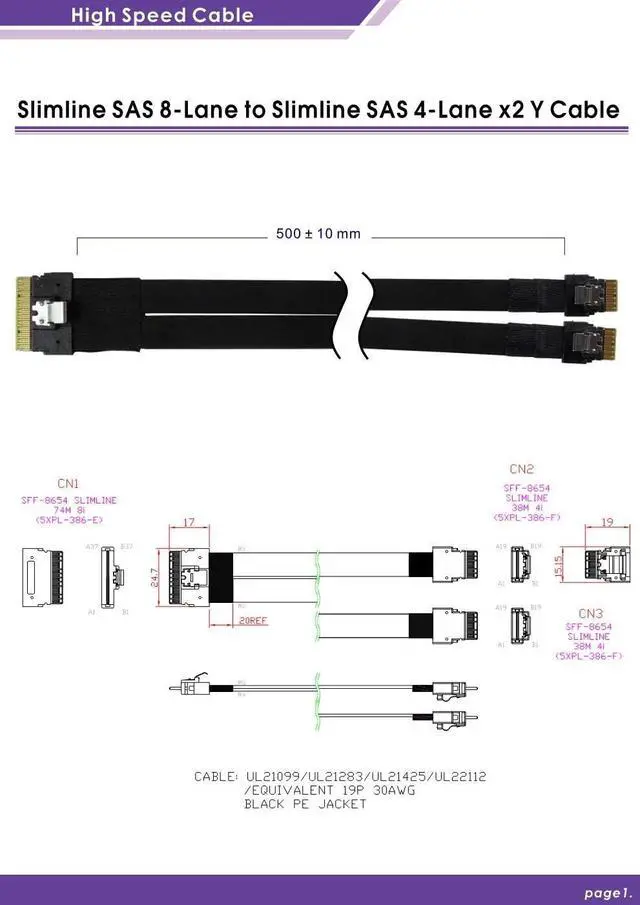 The Slimline SAS (SFF-8654) 8i to Slimline SAS (SFF-8654) 4i 2-Port Y-Cable is designed to connect an 8-lane host to two 4-lane devices.
