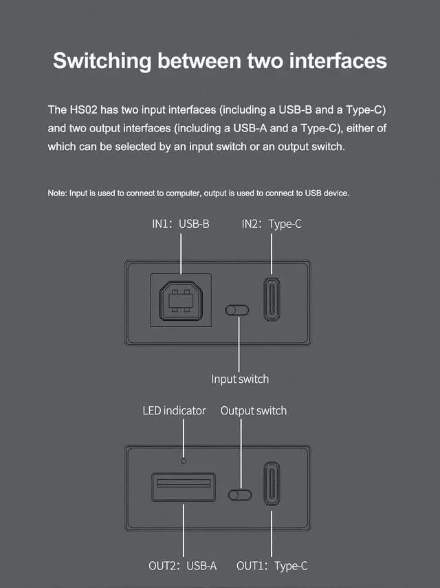 Switching between two interfaces: The HS02 has two input interfaces (including a USB-B and a Type-C) and two output interfaces (including a USB-A and a Type-C), either of which can be selected by an input switch or an output switch. Note: Input is used to connect to computer, output is used to connect to USB device.