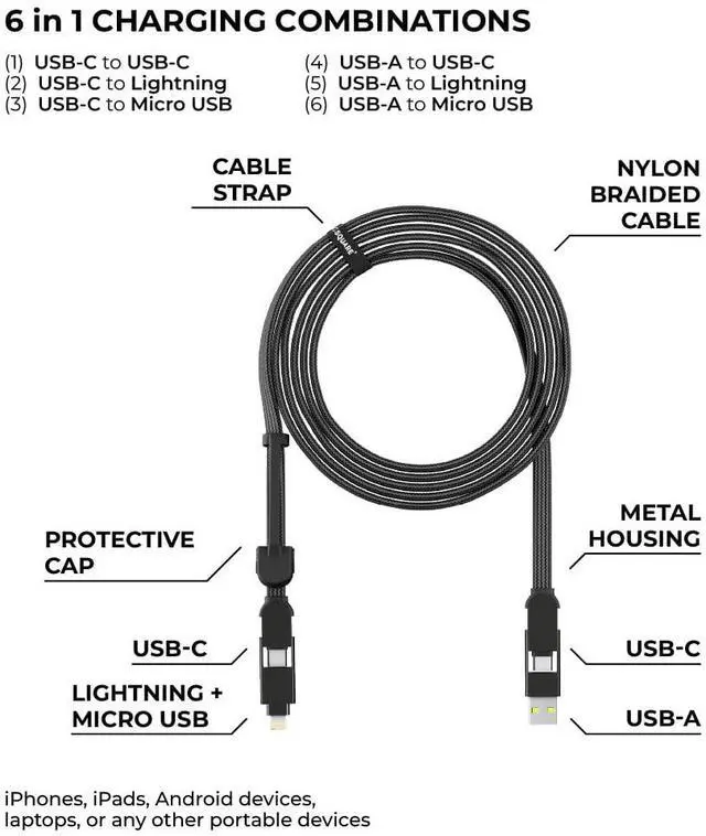 Unique Design: This universal cable cord's patented design allows you to connect any portable device to any power source for charging: USB-A to USB-C, USB-A to Lightning, USB-A to Micro USB, USB-C to USB-C, USB-C to Lightning and USB-C to Micro USB