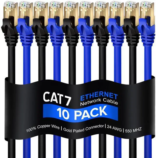 Cat 7 Ethernet Cable 1 ft - (10 Pack) High-Speed Cat7 Internet & Network LAN Patch Cables, RJ45 Connectors - Perfect for Gaming, Streaming, and More (Black and Blue)