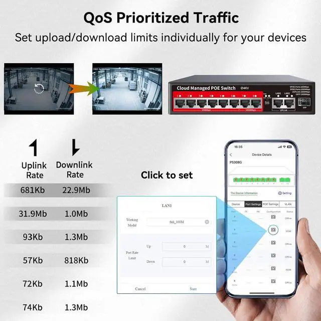 8-port managed poe switch@120W: STEAMEMO managed PoE ethernet switch features 2*1000Mbps PoE Ports, 6*100Mbps PoE Ports, 2*Gigabit Uplink ports and 1* 1.25G SFP port. 8*PoE ports providing up to 30W per port, total PoE budget 120W. This powerful combination of ports allows for flexible bandwidth allocation and cost - effective device integration. With the inclusion of 100/1000Mbps ports, you can optimize your network' s performance while minimizing expenses.