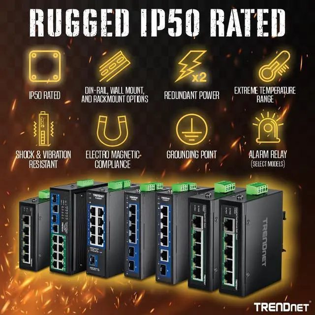 DIN RAIL & WALL MOUNTS: IP50 rated metal enclosure on the industrial switch with included DIN-Rail mount and wall mount hardware