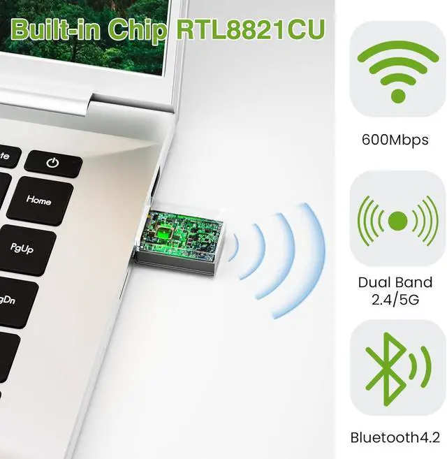 2.4G hz/ 5.8G hz DUAL BAND WIFIBuilt-in Chip RTL8821CU, lasted IEEE 802.11 a/b/g/n/ac universal wireless network technology. Offers speed up to 5.8GH z (433Mbps) and 2.4GH z (150Mbps), 5.8GH z is perfect for HD video streaming and lag-free online gaming, 2.4GH z Wi-Fi for normal use such as web surfing, music, chat online etc.