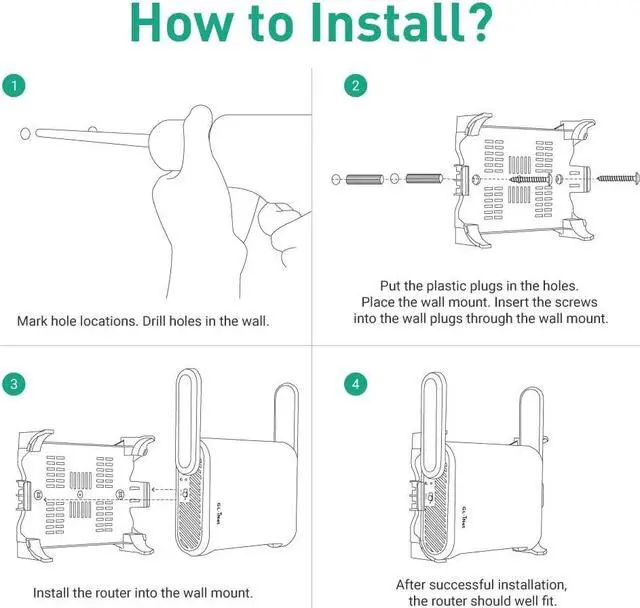 QUICK & EASY INSTALLATIONCome with screws and plastic wall plugs. You can easily mount you GL. iNet router securely on any vertical surface, such as wall, cabinet or anywhere you like.
