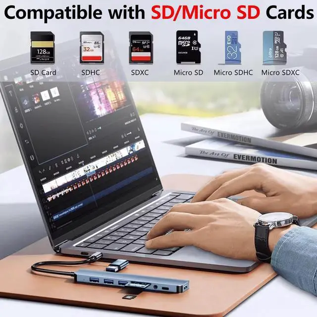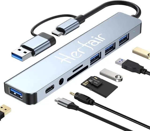 USB Hub: This usb port hub extender can instantly expands your USB-C or USB female port into 8 essential ports, including 4x USB ports, 1x SD/TF card slots, 1x 3.5 mm audio jack and 1x USB-C powering port. A helpful gadget that let you connects various peripherals for increasing productivity and convenience.