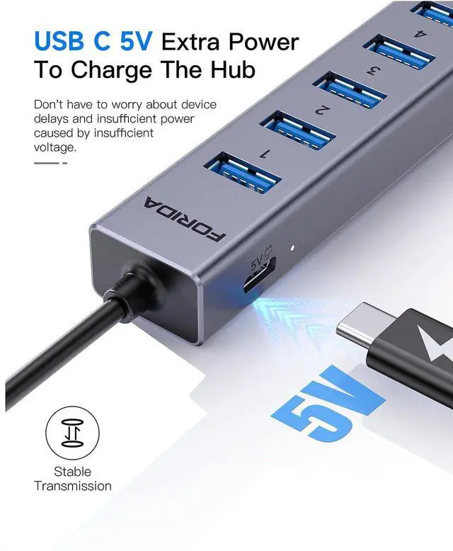 Smart Charging PortThe USB 3.0 hub comes with an additional USB C 5V/3A power interface, which can provide up to 15W charging power. When you use multiple USB 3.0 interfaces at the same time, you don' t have to worry about device delays and insufficient power caused by insufficient voltage.