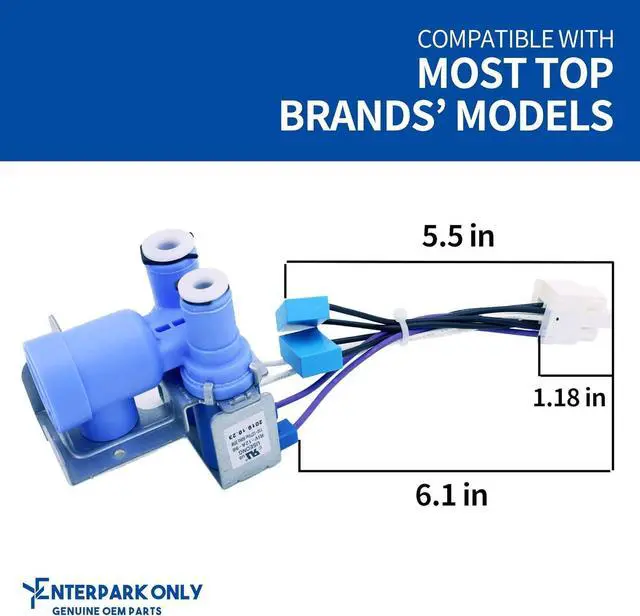 Water inlet valve DA62-02360B supplies water to the refrigerator ice maker and water dispenser.