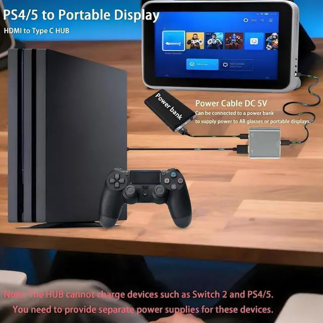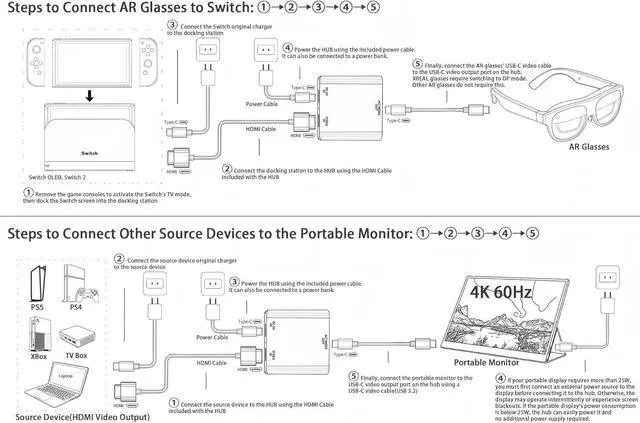 Compatible with USB-C Portable Monitors: The HUB' s power cable can only supply power to AR glasses and displays, with a minimum power output of 10W (5V 2A). It cannot power source devices, so source devices require separate charging. When the portable display' s power consumption is below 25W, the hub can easily power it. If your portable display requires more than 25W, you must first connect an external power source to the display before connecting it to the hub. Otherwise, the display may operate intermittently or experience screen blackouts. Please note the power consumption of the monitor.