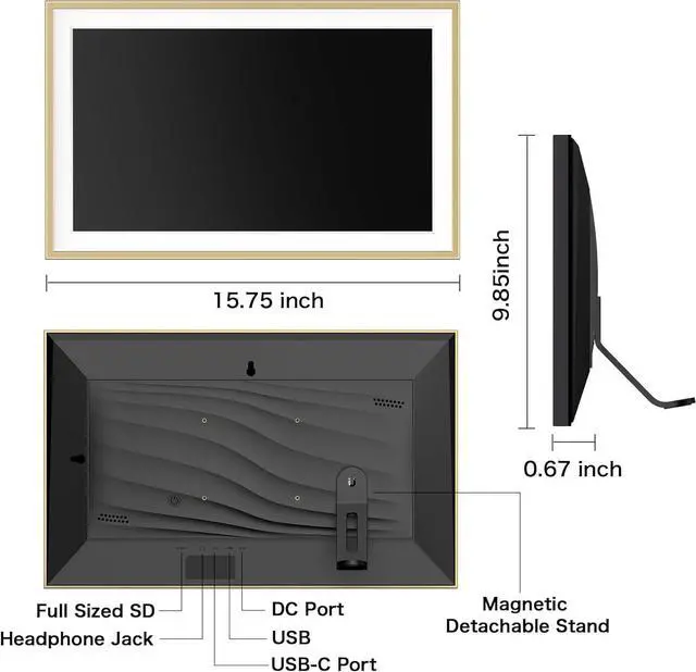 FHD IPS Touch Screen Display; Pastigio golden digital picture frame equipped with a 15.6 inch digital panel with FHD 1920x1080P for vivid color and exquisite details. Set up and view photos conveniently with the touch screen. Through the wifi digital photo frame, You can see the furry hair of your lovely pet, see the youthful freckles on smiley faces, see how every teeny tiny detail builds up your colorful life. Multiple image formats are supported, JPG/JPEG/BMP/PNG, and video format by MP4