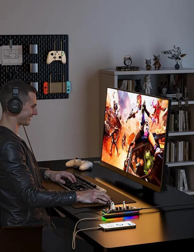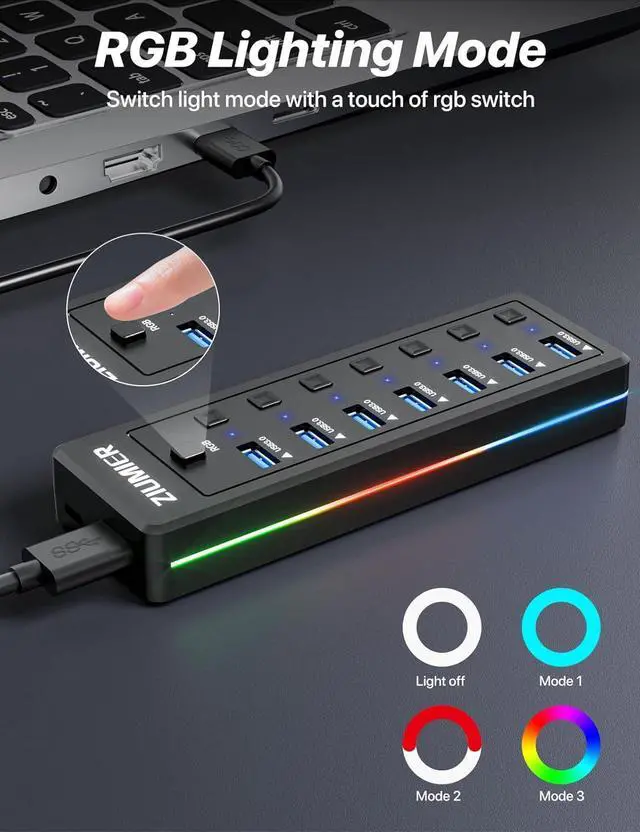 [RGB Lighting Modes] With the simple press of the RGB button, you can cycle through the Three RGB lighting modes. This USB hub transforms your desk setup, say goodbye to messes, bringing an immersive new experience to both gaming and work.