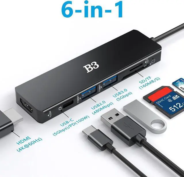 Multi-port USB C Hub: Expand your laptop' s capabilities effortlessly. This USB C adapter consolidates all the essential ports you need into one compact HDTV hub. It features a 4K@60Hz HDMI port, one USB 3.0 port, one USB 2.0 port, separate SD and TF card readers, and a 100W Type-C Power Delivery charging port, eliminating dongle clutter.