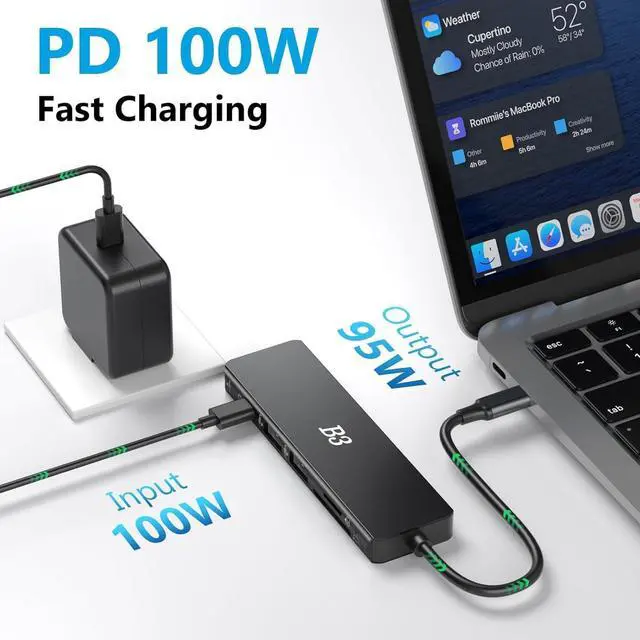 High-Speed Data Transfer & Charging: Transfer files in a flash. Connect external hard drives, thumb drives, and other peripherals with the USB 3.0 port, achieving data transfer speeds of up to 5 Gbps. Simultaneously, the 100W Power Delivery pass-through charging port powers up your host laptop quickly and efficiently, all through the usb c hub. Ensure your laptop' s USB-C port supports PD protocol and use a 65W+ charger for best performance.