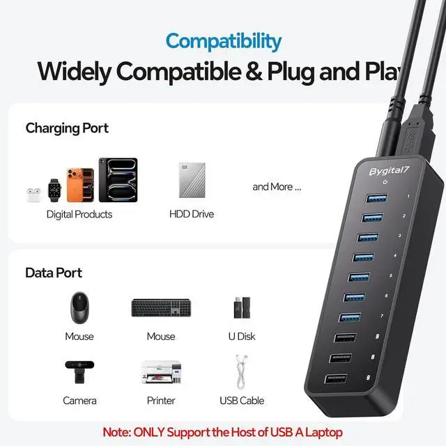 High-Speed Expansion Data Hub: The multi usb hub equiped with 7-ports usb 3.0 devices simultaneously and enjoy data transfer speeds of up to 5Gbps for external drives, peripherals, and accessories. also comes with smart intelligently 3-Power Ports for Smarphone and all other devices