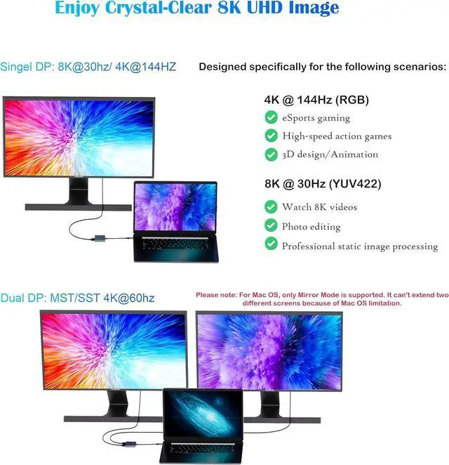 UHD Image: Unlike other Displayport adapter on the market, ours has much higher Resolution and Refresh Rate! Single port supports 8K@30HZ / 4K@144HZ. When Use dual ports simultaneously, it supports max resolution up to 4K@60Hz. This product is the best choice for those who demand high clarity monitor images like Photo editing, Watch 8K video, Professional static image processing, eSports Gaming, High-speed action games, 3D design/Animation etc. (:,... )
