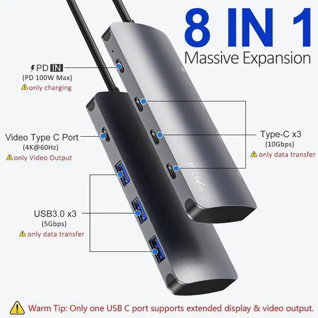 USB-C Hub: This usb c multi adapter turns a single USB-C port into 8 ports. It features 3× USB-C 10Gbps data ports, 3× USB 3.0 5Gbps data ports, 1× USB-C video output (4K@60Hz), and 1× 100W Power Delivery charging port. Perfect for professionals and multitaskers alike.
