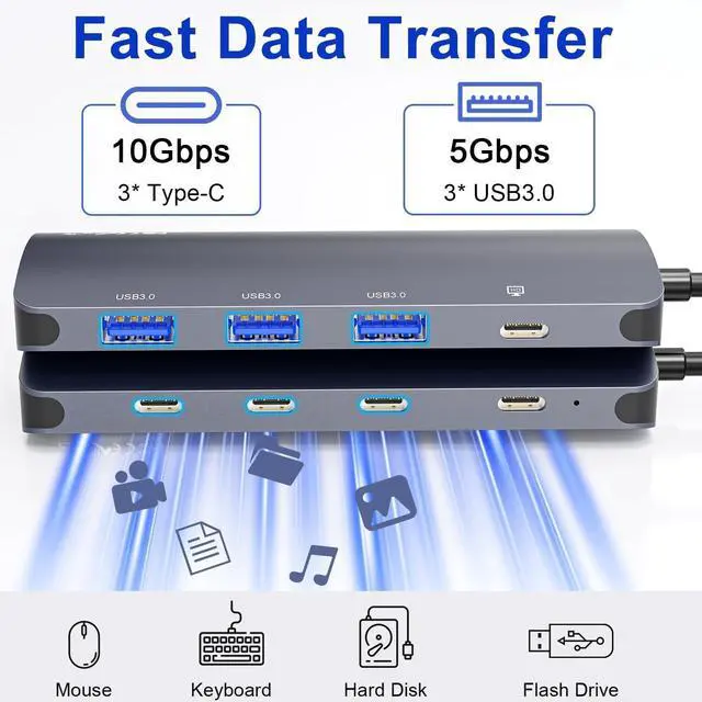 High Speed Data Transfer: Transfer files seamlessly using three USB-C 10Gbps ports and three USB 3.0 5Gbps ports. Back up 1GB files in about 1 secondideal for large videos, project files, or gaming setups. More reliable connection, enjoy a smoother online gaming or working experience.