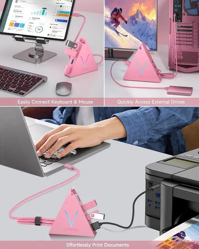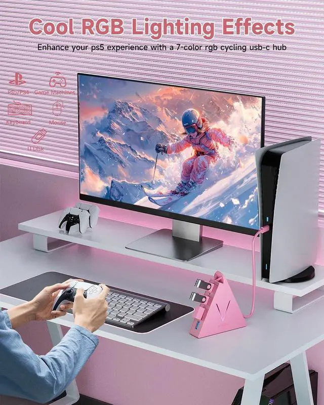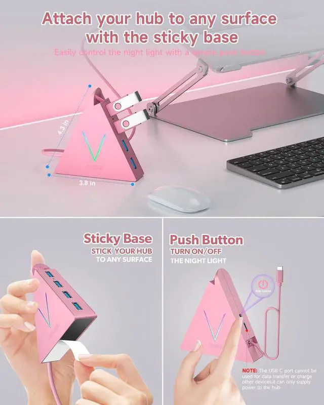 Stunning Visual AppealThe distinctive Flying V design at the top and sides creates an eye-catching profile that pushes the limits of traditional aesthetics. The decorative V-shaped night light cycles through seven vibrant colors, providing soft illumination that adds a neon-like glow to your deskperfect for both home and office spaces. This unique light not only enhances your decor but also creates an exciting atmosphere, making it a standout feature in any room. (Note: This hub is not designed for charging devices. )