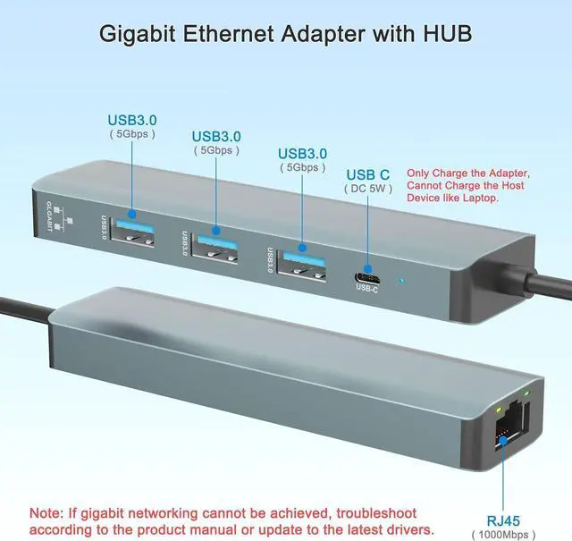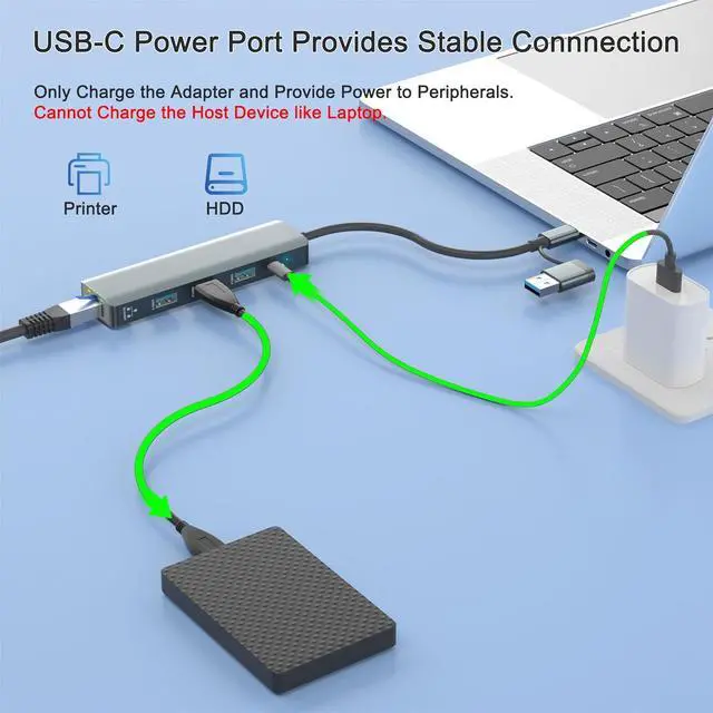 USB-C Power Supply for Peripherals: The usb c to ethernet has an extra Type-C power supply port to power high-power devices like hard drives and get stable performance. (Note: Can' t charge host devices like laptops, only for high-power peripherals. )