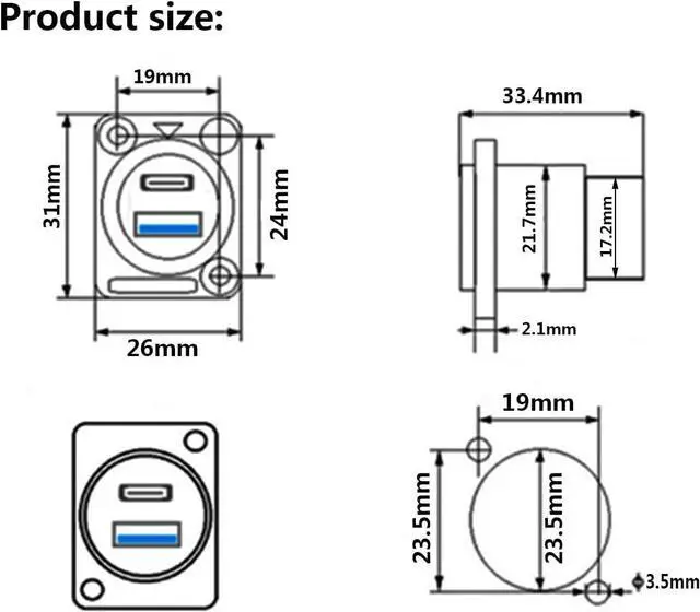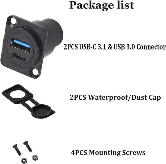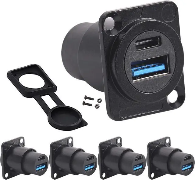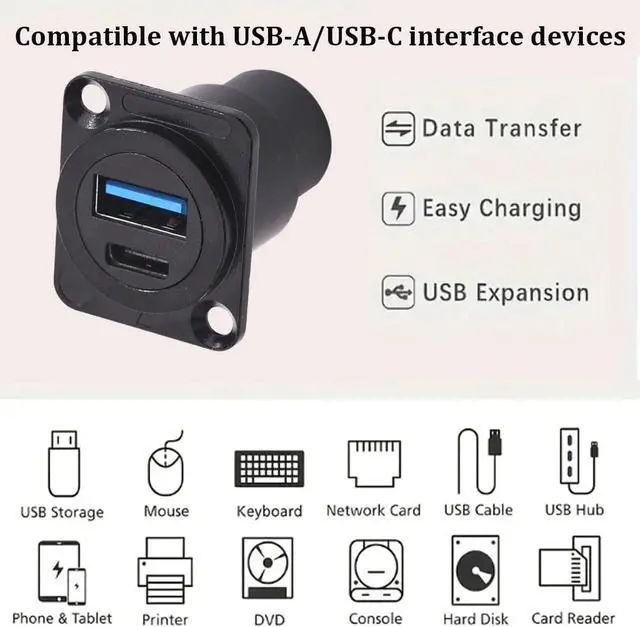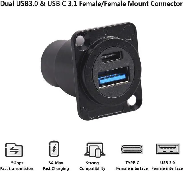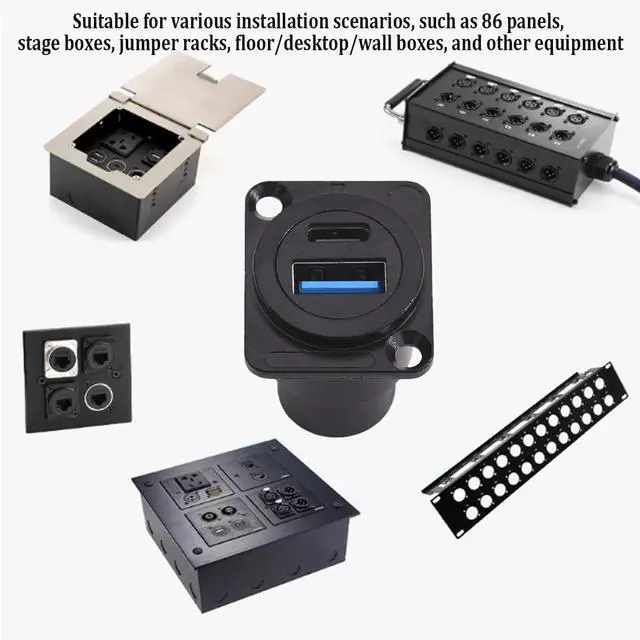 Applications -- This dual USB port (USB 3.0 +USB-C) connector can simultaneously connect 2 USB devices for data transfer or charging, making it ideal for use with smartphones, laptops, tablets, and other devices with USB-A&Type-C ports. In addition, the D-panel design is suitable for open or concealed mounting on XLR panels, equipment panels, patch panels, cabinets, desktops, and walls.
