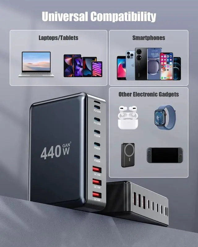Ultra-Powerful 440W Charging StationExperience the convenience of high-speed charging for eight devices simultaneously with our potent 440W USB C Charger. Our USB C charger block with 5 USB-C ports and 3 USB-A ports, Streamlining your charging process, allowing you to power up all your devices simultaneously with ease. When a single device is connected to the USB-C1/C2 ports, it enjoys an impressive charge of up to 100W.