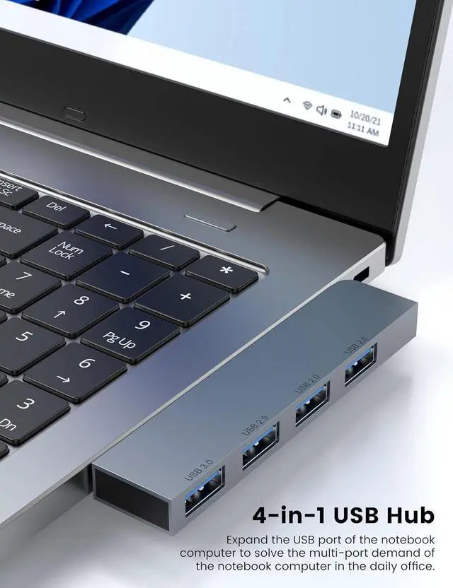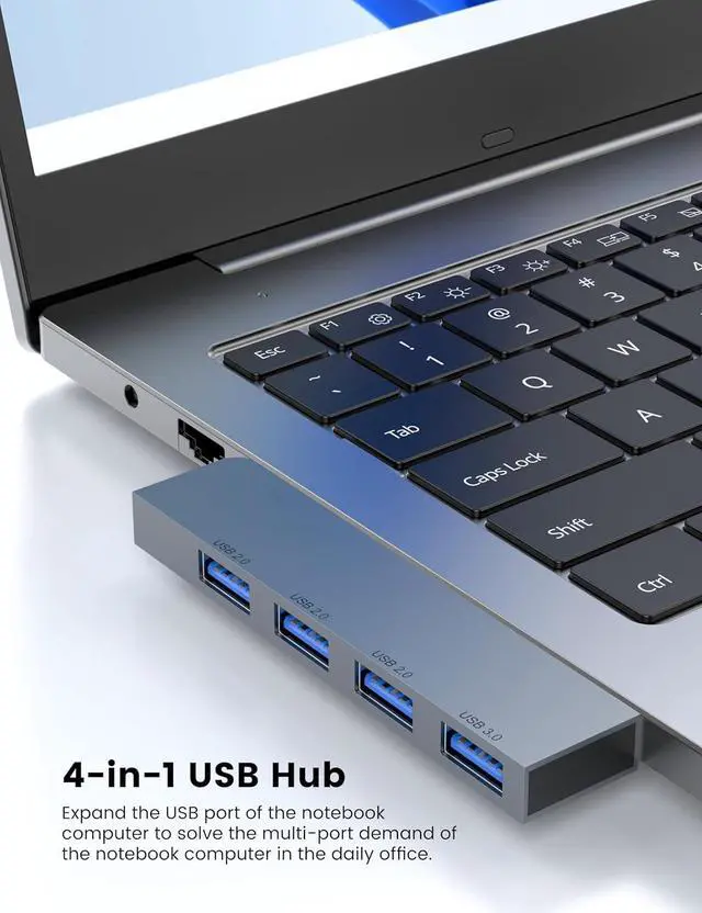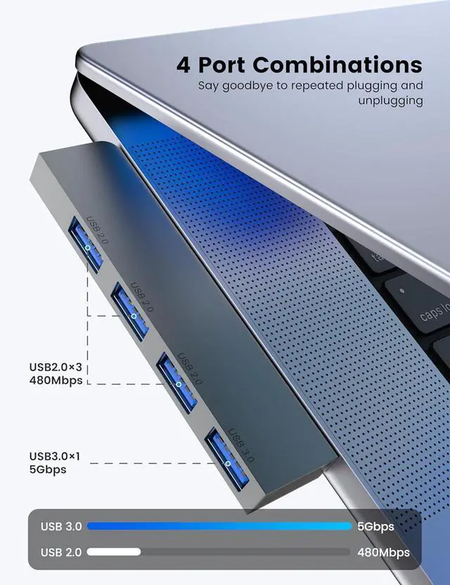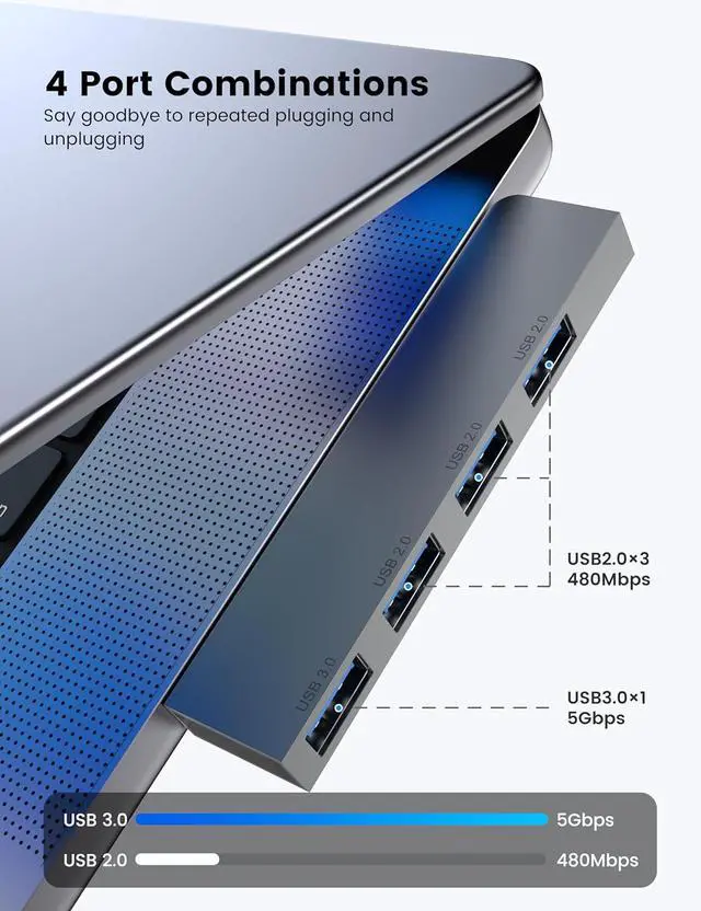USB Hub Right and left Model tansfer a single USB port into 4 USB data ports, you can get 1 USB 3.0 and 3 USB 2.0 ports with your laptop. Support 4 ports to work at the same time, without any pressure, and keep the temperature in the middle range. Plug and play, no need driver, easy to use.