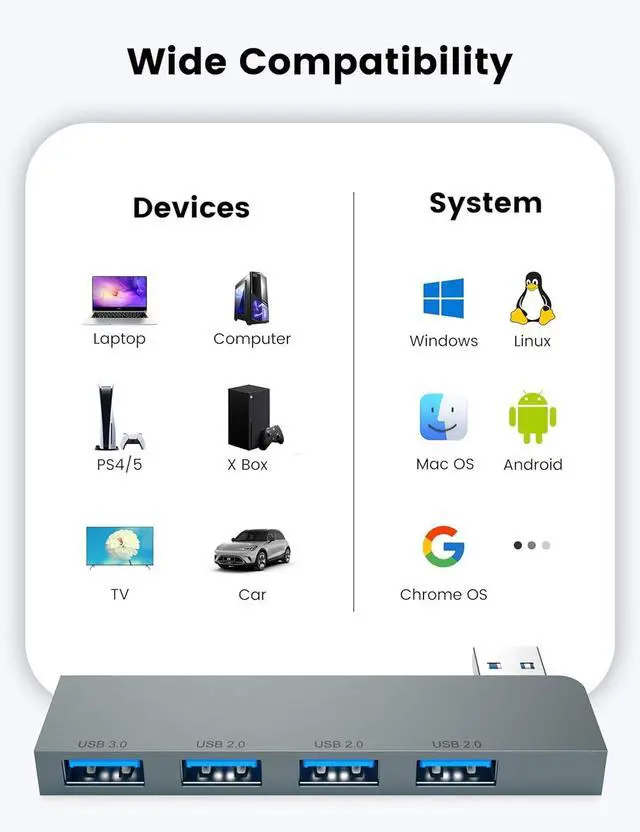 Usb port hub has a wide range of compatibility, including USB cables, flash drives, mice, keyboards, mouse, card reader, cellphone OTG adapter, printer, camera, USB fan. Also works with hubs for MacBook Pro 2021/2020/2019, Google Chromebook Pixelbook, Samsung series and laptops and more USB devices.