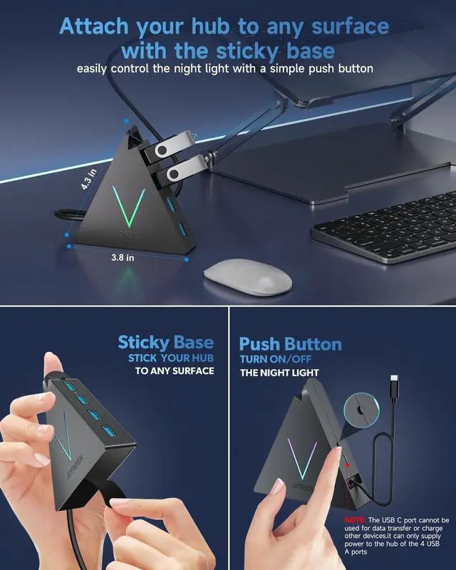 2FT Cable for Easy ConnectivityThis USB hub tower comes with a 2ft cable, making it perfect for setups where your laptop is placed on a stand or or your desktop pc is placed under the desk. Unlike typical short USB hubs, this extra cable length prevents the frustration of unreachable ports or devices hanging in mid-air, ensuring a seamless and stable connection no matter where your equipment is positioned. Additionally, this USB hub includes double-sided adhesive tape to securely attach it to your desktop, keeping your workspace tidy while providing easy access to external devices.