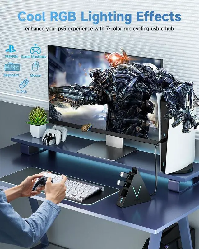 USB Port Expansion This 4-port usb c to usb hub expands a single USB C port on your gaming laptop into four USB 3.0 ports, allowing you to easily connect your gaming peripherals, such as gaming keyboards, gaming mice, gamepads, and Bluetooth headsets. Perfect for gaming consoles like PS5 and Nintendo Switch, this ps5 usb hub provides seamless connectivity for all your gaming accessories. (Note: This hub is not intended for charging devices. )