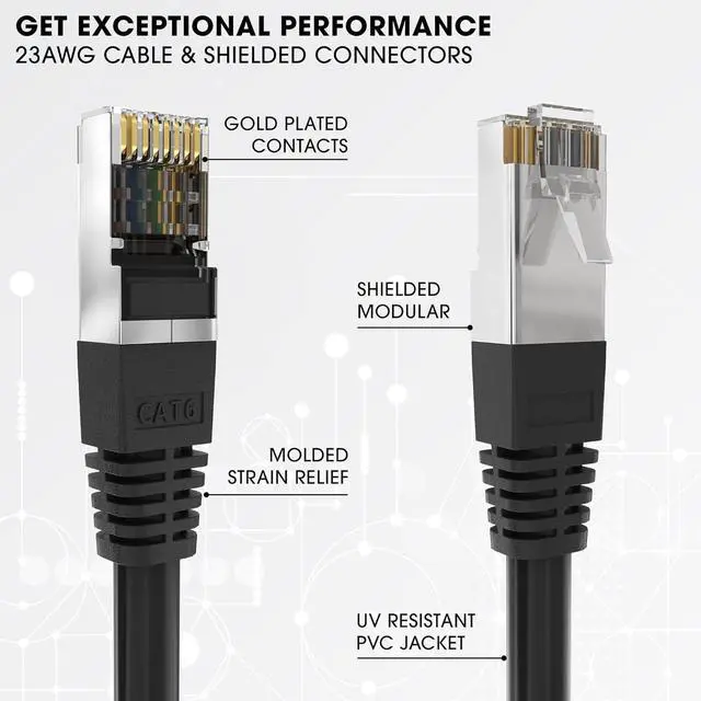 SUITABLE FOR DIRECT BURIAL OUTDOORS | Ultra Heavy-Duty Weatherproof Design Withstands High & Low Temperatures, Direct UV Sunlight, Rain, Snow, Dirt, Dust, Sand & Other Outdoor Exposure for Years of High-Speed Networking | Strong, Durable Features Include PVC Waterproof Jacket, RJ45 Shielded Connector Plugs, 23AWG BC Pure Copper (not CCA), FTP Foil Twisted Pair Cabling & Other Hardy Components