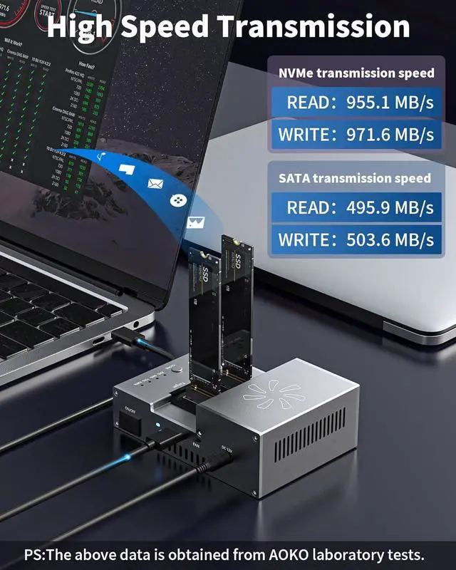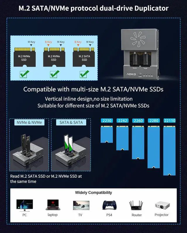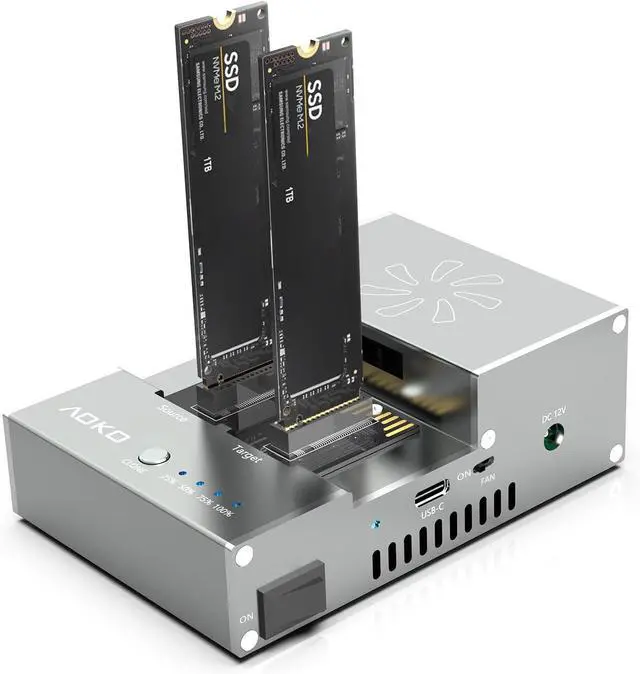 SSD Reader: This AOKO hard drive docking station supports 2 x M.2 NVMe or 2 x M.2 SATA SSDs for connecting to a computer to read and write data. It can convert SSDs to USB without installing drivers, plug and play. (Please note: Not compatible with Mini SATA or AHCI SSD, does not support simultaneous insertion of M.2 SATA/NVMe)