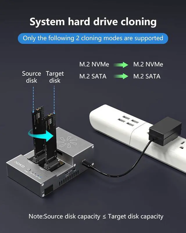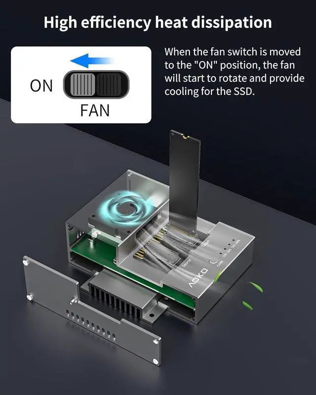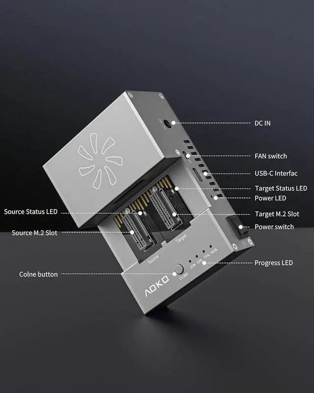 Excellent Heat Dissipation: AOKO NVMe Cloner is made of all aluminum +built-in turbo fan for continuous and efficient heat dissipation, so you don't have to worry about the hard drive slowing down or dropping out due to overheating over a long period of time, and good heat dissipation protects the hard drive, prolongs its service life, and improves your work efficiency.