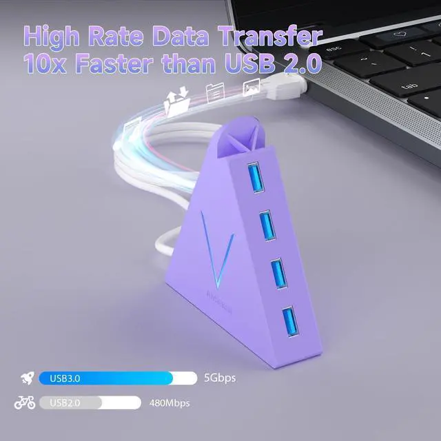 5Gbps Data Transfer SpeedThis USB 3.0 hub delivers lightning-fast transfer speeds of up to 5Gbps10 times faster than USB 2.0! Quickly copy HD movies, photos, songs, and large files from your computer to your hard drive in seconds, minimizing wait times and making file transfers effortless.