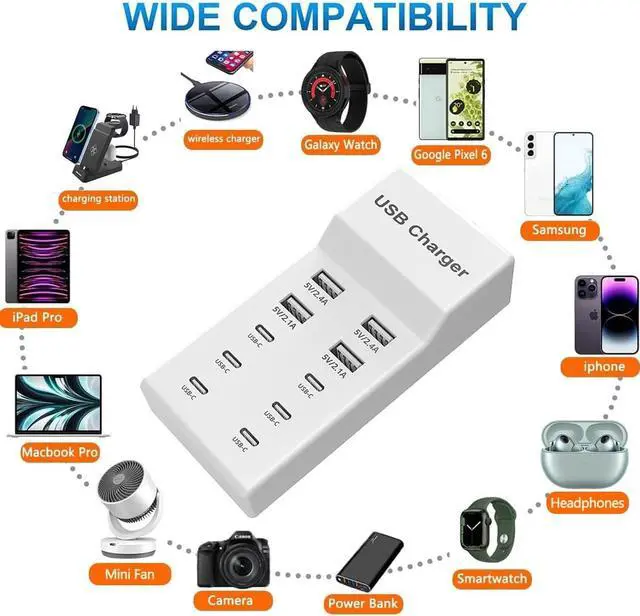 10 Ports USB ChargerThis Charger With 6 USB-C ports and 4 USB-A ports, you' re ready to charge ten of your devices simultaneously. Automatically detect all connected devices, adjust the output accordingly, ensure a constant voltage to minimize charging time.