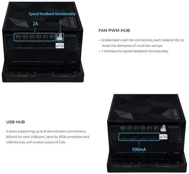 6 extended 4-pin fan connectors, each rated at 2A, to meet the demands of multi-fan setups.