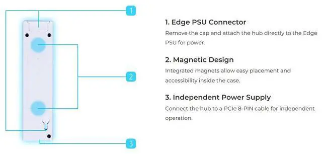 Remove the cap and attach the hub directly to the Edge PSU for power.Integrated magnets allow easy placement and accessibility inside the case.Connect the hub to a PCIe 8-PIN cable for independent operation.