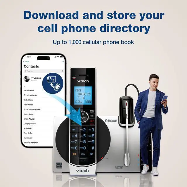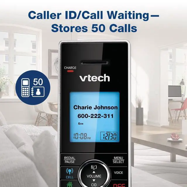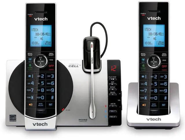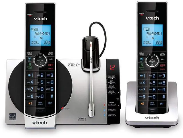 VTECH DS6771-3 VTECH TWO HANDSET CORDLESS PHONEDownload and store your cell phone directoryConnect to CellContact shareHandpick the mobile phone contacts you want to add to your systemCaller ID shareAdd contacts from your landline system to your mobile phoneEasily register your cell phoneDigital answering systemDigital answering system voice guideMessage counterFullduplex handset speakerphoneCaller ID/call waitingstores 50 callsBacklit keypad and displayCall blockQuiet modeECO mode powerconserving technologyExpandable up to 5 devices2 devices can be cordless headsets (uses DS6072 accessory handset and IS6200 accessory headset) DECT 6.0 digital technologyUp to 23 minutes of recording timeCall screeningCall interceptRemote accessMessage retrieval from handsetMessage time and date stampCompatible with VTech models IS6200 DECT 6.0 cordless headset and AT&T model TL80133 DECT 6.0 speakerphone1, 000 name and number phonebook directoryIntercom between handsetsIntercom between handsets and headsetConference between an outside line and up to 2 cordless handsetsVoicemail waiting indicatorLast 10 number redialMuteAny key answerVolume controlTrilingual promptschoose between English, Spanish and French