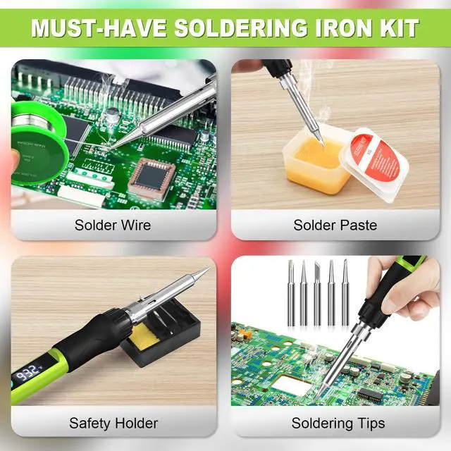 Soldering Iron Kit, 100W Soldering Gun with LED Digital Display, Adjustable Temperature 356-932 Solder Kit for Electronics, Includes Soldering Iron Tip, Solder Wire, Stand, Tweezers and Paste, Green