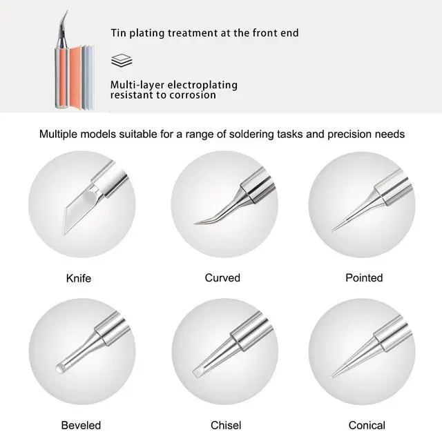 6-in-1 (2.4D ,B ,K , 3C, I, IS,), Soldering Iron Tip Kit with Chisel, Conical, Knife, Beveled, Pointed and Bent Tips”. 6 different Solder Welding Replacement Tips for a range of soldering tasks and precision needs