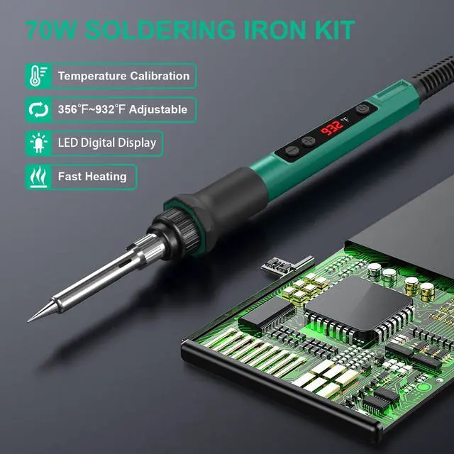 High-Performance Soldering: 70W soldering iron delivers rapid heating and stable thermal recovery, ensuring consistent heat even on large joints. Easily adjust the temperature from 356°F to 932°F using the intuitive + and - buttons. The built-in temperature calibration function guarantees precise control for professional results.
