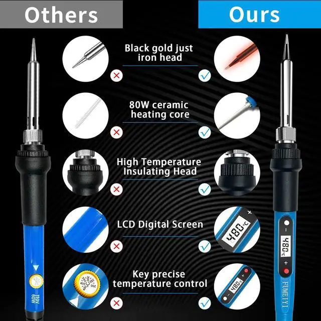 1.Fast Heating: This soldering iron adopts high quality ceramic core, 80W high power, heating to the working temperature within 10 seconds, the heat output maintains a constant temperature.110-120 volt digital soldering iron can be accurately adjusted to 180 -480 / 356 °F -896 °F and switched between / °F.