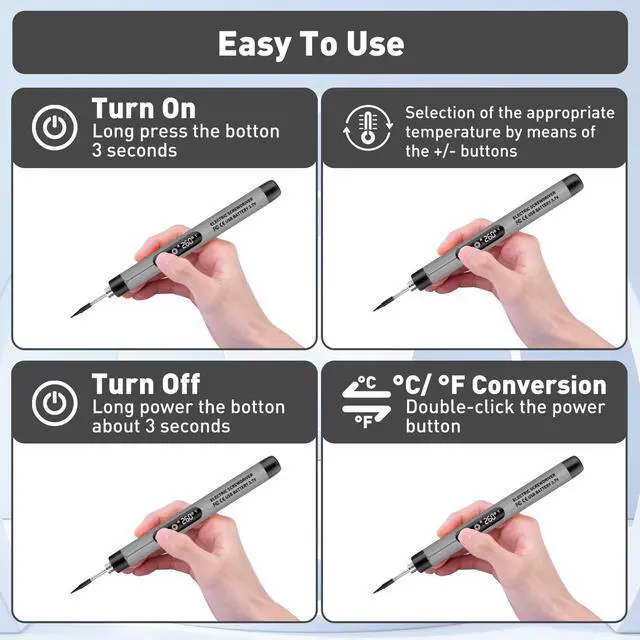 Easy to Operate: Soldering iron kit just long press for 3 seconds to turn on/off, temperature adjustment button allows you to face the temperature more comfortably when you need to work. There is a layer of heat insulation on the surface to prevent the iron from burning your hands during operation.