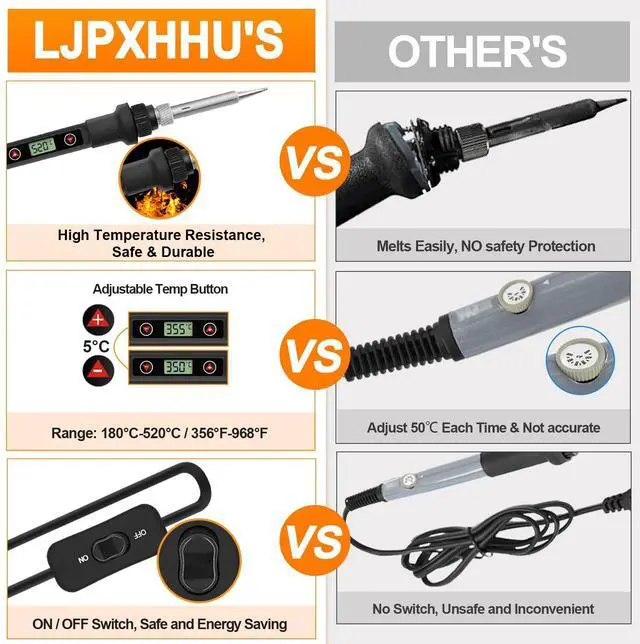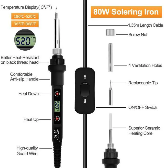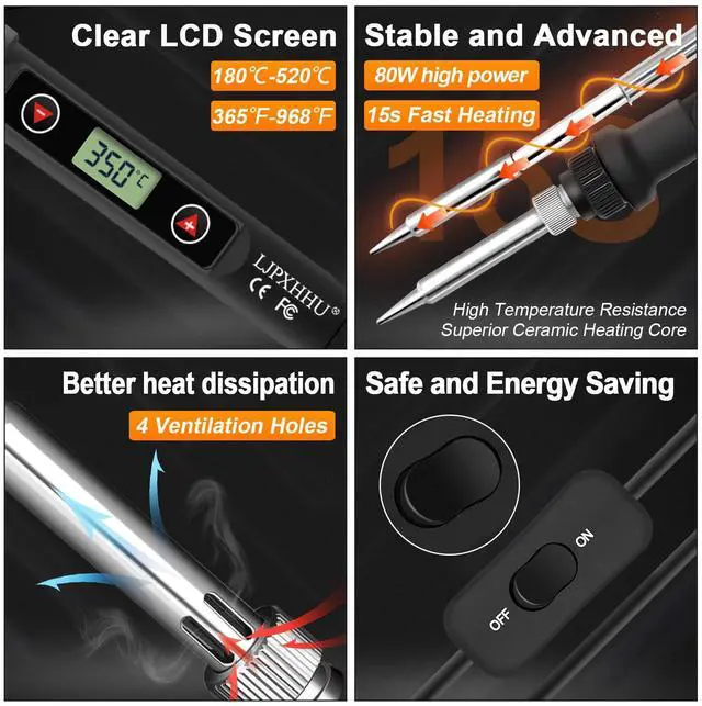 1.Quickly heats up in 15 Seconds, 5? Precise temperature control 2. 80W Soldering Iron with 4 ventilation holes provide better heat dissipation. 3. High temperature resistant material. 4. Wider Temp Range of 356?-968?/180-520? 5. Great tool for hobbyists, beginners and professionals.