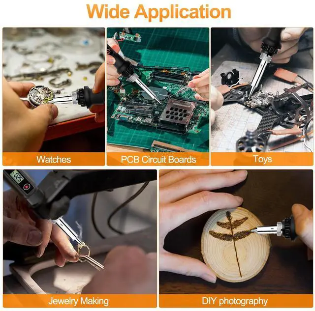 This electric soldering iron kit is widely used for soldering PCB circuit boards, jewelry making, repair of electronics, metal welding, guitars, watches, mobile phone, computer hardware and TV, wires welding, DIY for crafts, wood carving, home appliances repair, welding engineer training and more.