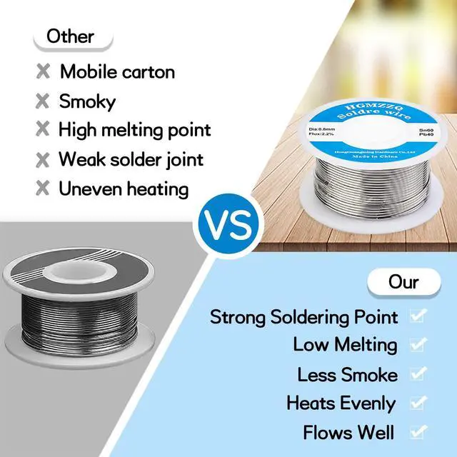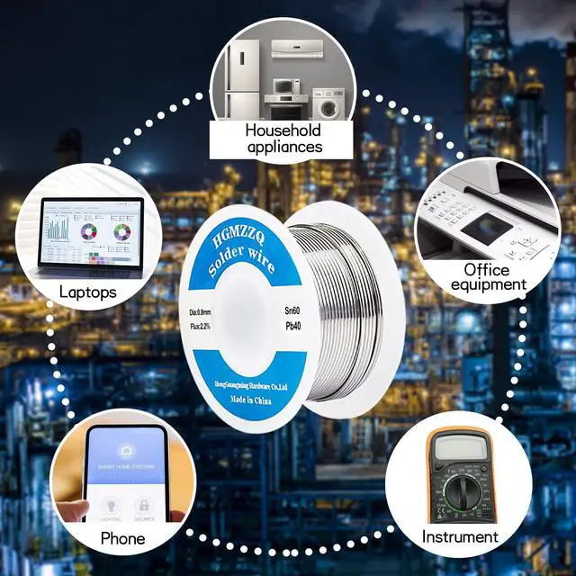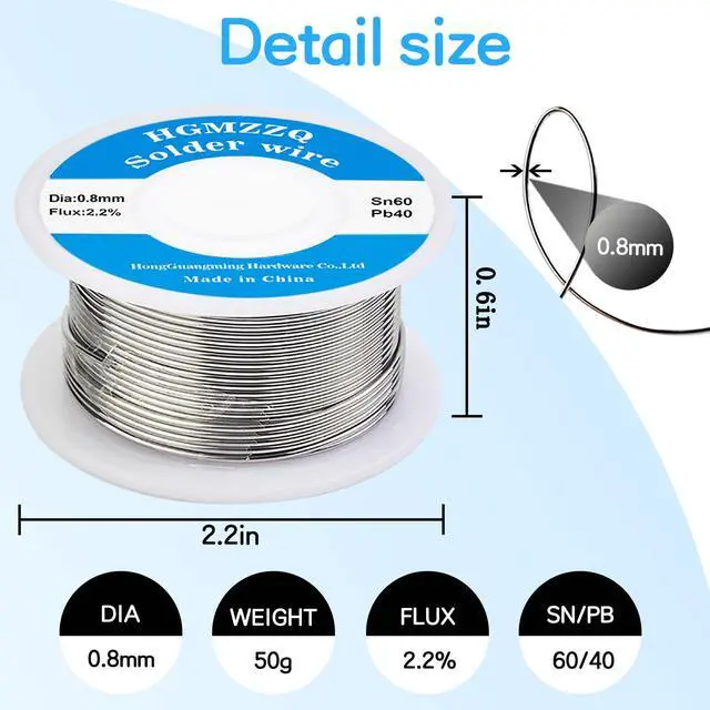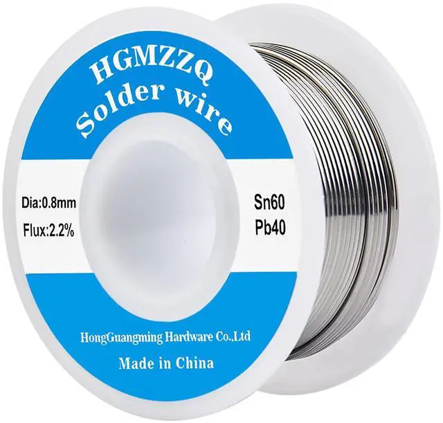 Product Name: solder wire Brand: HGMZZQ Alloy:Tin 60% Pb 40% The flux: 2.2% The wire diameter: 0.8mm (0.031inches) The volume size: 2.2 x 2.2 x 0.62 inches package: 1pc x 0.8mm 50g of solder wire spool Solder is widely used in the electronics industry, home appliance manufacturing, automobile manufacturing, DIY and routine if you are not satisfied with the quality, but in 30 days for a full refund. WARNING:This product can expose you to lead, which is known to the State of California to cause birth defects or other reproductive harm. For more information go to www.P65Warnings.ca.gov.